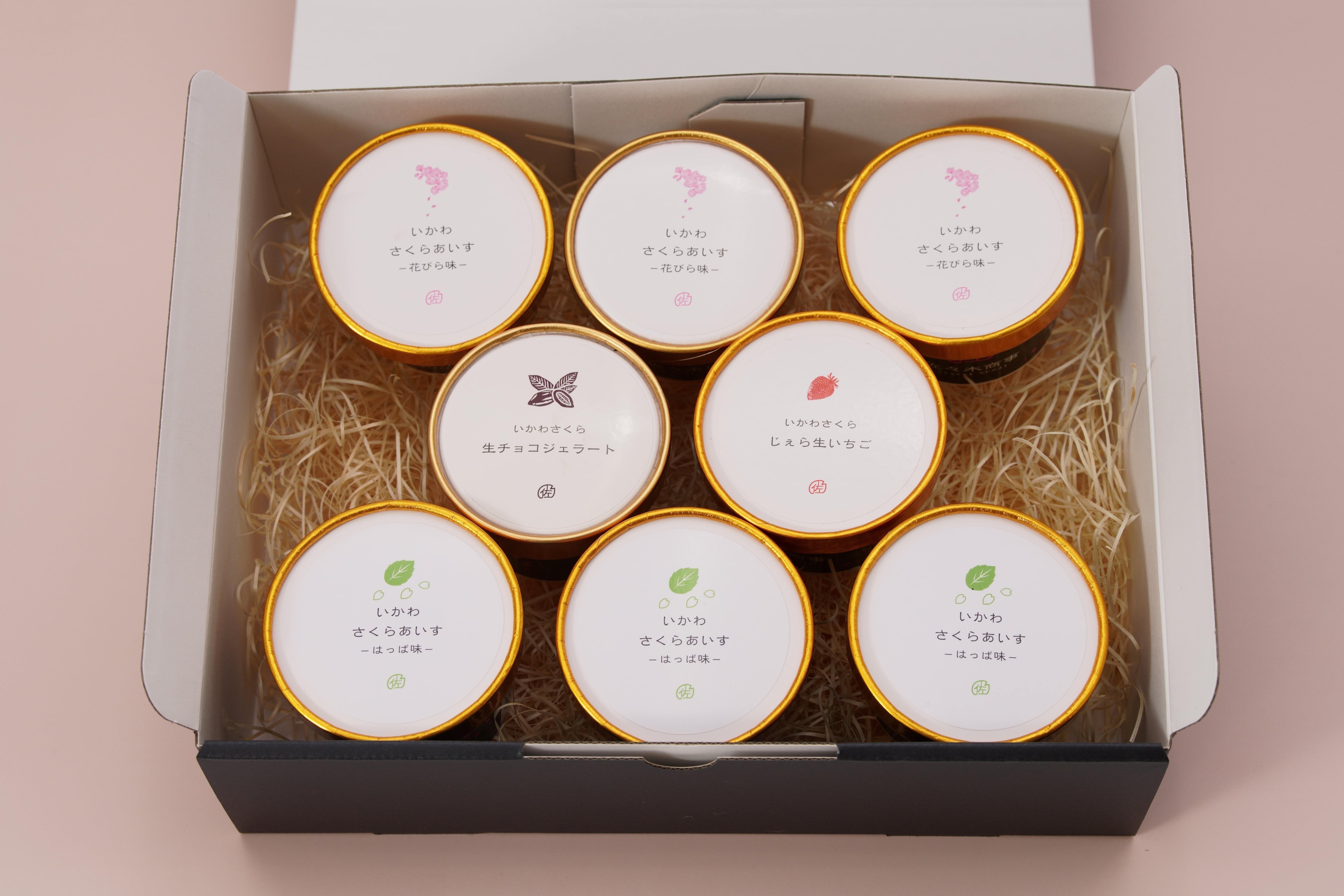 さくらあいす<花びら味>3個、<葉っぱ味>3個、<じぇら生いちご>1個、<生チョコジェラート>1個のセットとなります。